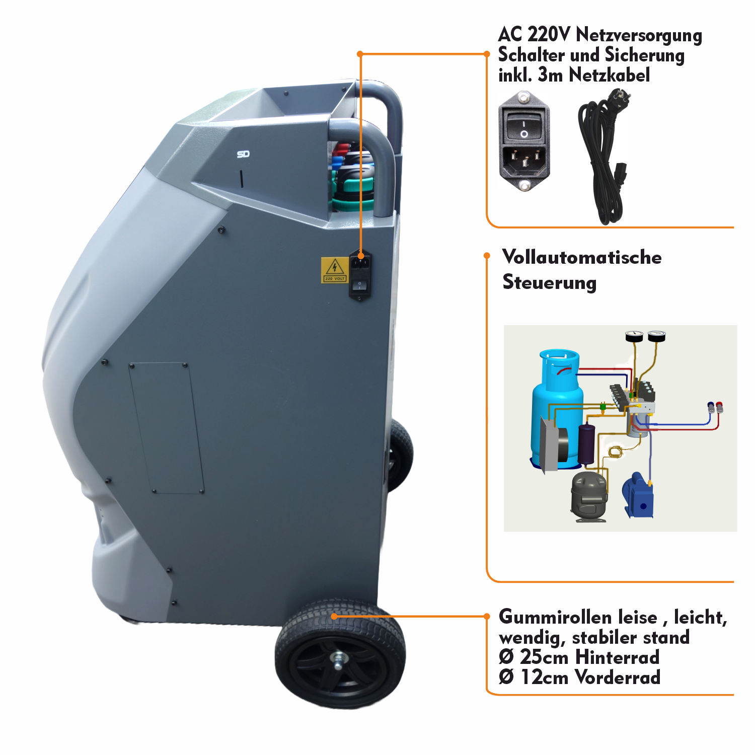 • Netzkabel 3m / Schlauchlänge 2.5m
